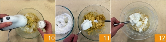 Adicione também o fermento em pó peneirado 10 e misture bem com a batedeira. Você obterá uma mistura compacta. Incorpore as claras aos poucos 11, mexendo delicadamente de baixo para cima 12.