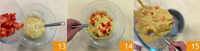 Adicione então os morangos em cubos 13 e misture, sempre delicadamente 14. Despeje a mistura em uma forma de 17 cm de diâmetro e 9 cm de altura, forrada com papel manteiga 15.