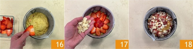 Decore a superfície com as fatias de morangos 16 e as lâminas de amêndoas 17. Asse em forno estático pré-aquecido a 180°C por 30-35 minutos; uma vez cozido, retire do forno e deixe esfriar 18.