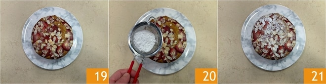 Transfira para um prato 19, polvilhe com açúcar de confeiteiro 20 e sirva seu bolo de iogurte com morangos e amêndoas 21!