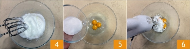 Bata as claras em neve 4 e reserve, depois adicione o açúcar nas gemas 5 e misture com a batedeira elétrica 6.