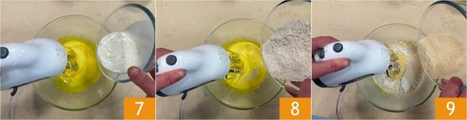 Quando estiverem bem misturados, adicione o iogurte 7, a farinha integral já peneirada 8 e a de amêndoas 9.