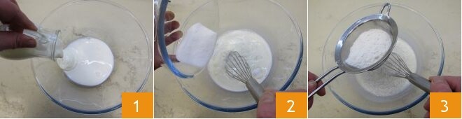 Para preparar o bolo de iogurte e maçã sem ovos, comece deixando todos os ingredientes frescos fora da geladeira por um tempo: assim, você garantirá o sucesso do bolo, pois todos terão a mesma temperatura ambiente. Em seguida, despeje o leite em uma tigela junto com o iogurte grego 1, misture com um batedor e adicione o açúcar refinado 2. Misture bem, depois coloque uma peneira sobre a tigela e peneire a farinha 3