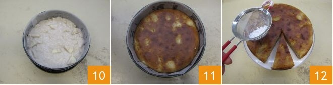 Espalhe para nivelar o bolo 10 e asse em forno estático pré-aquecido a 170° por cerca de 55 minutos (para esta receita, a cozedura em forno ventilado não é recomendada, pois o bolo pode secar demais; se preferir tentar, a cozedura ideal é a 160° por cerca de 45-50 minutos), fazendo adequadamente o teste do palito: se ele sair seco, então o bolo está cozido. Recomendamos também, se perceber que a superfície está escurecendo demais, durante a cozedura cubra o bolo com papel alumínio. Retire do forno o bolo de iogurte e maçã sem ovos e deixe esfriar completamente antes de desenformar 11. Se preferir, sirva seu bolo de iogurte e maçã sem ovos com uma pitada de açúcar de confeiteiro 12.