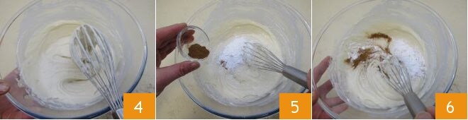 misture energicamente para absorvê-la, evitando assim a formação de grumos 4. Em seguida, adicione o fermento em pó e a canela em pó 5 e continue a incorporá-los à mistura 6.