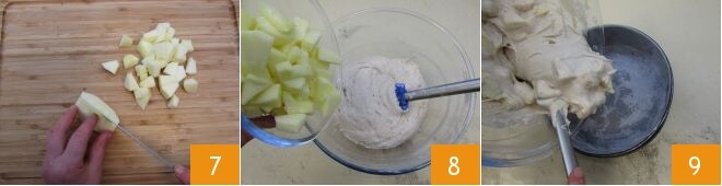 Neste ponto, você pode descascar as maçãs e remover o miolo (você obterá cerca de 300 g de maçãs). Corte-as em fatias e depois em cubos de cerca de 2 cm 7. À medida que os corta, despeje imediatamente na tigela que contém a massa para evitar que os cubos escureçam 8. Misture bem tudo com uma espátula e despeje a mistura em uma forma de 24 cm de diâmetro (se possível, use uma forma de aro removível), forrada com papel manteiga 9.