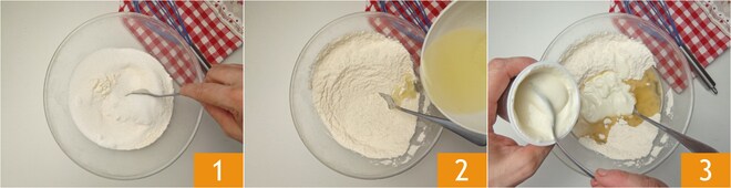 Para preparar o bolo de iogurte sem ovos, em uma tigela coloque a farinha, o fermento e o açúcar 1 e misture com um garfo. Adicione o óleo de girassol 2 e o iogurte de limão 3.