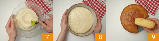 A massa, após ser trabalhada, deverá parecer um creme aveludado 7. Unte e enfarinhe uma forma de aro removível de 22 cm. Despeje e nivele a massa 8. Asse em forno pré-aquecido ventilado a 180° por 35 minutos, fazendo o teste do palito para verificar o cozimento. Se sair seco, o doce está pronto. Deixe esfriar completamente antes de retirá-lo da forma e cortá-lo 9.