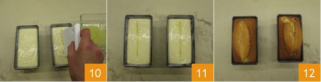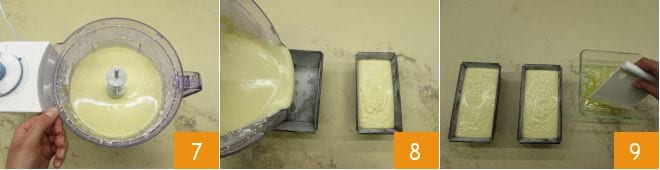 Trabalhe tudo em velocidade máxima por cerca de 3 minutos e meio. Enquanto isso, unte e enfarinhe duas formas de 16x8 cm ligeiramente inclinadas. Assim que obtiver uma massa homogênea 7, transfira-a para dentro das formas 8. Como toque final, mergulhe uma espátula ou a lâmina de uma faca primeiro na manteiga derretida 9