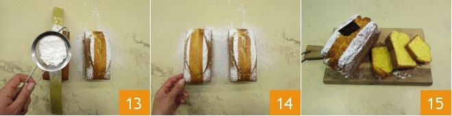 Neste ponto, desenforme-os e decore-os com açúcar de confeiteiro usando uma tira de papelão para colocar sobre a rachadura central 13 14. Os bolos de iogurte estão prontos para serem saboreados 15.