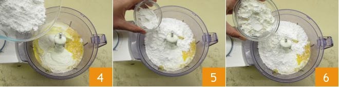 o iogurte grego, o açúcar de confeiteiro 4, o sal, o fermento 5 e a fécula 6.