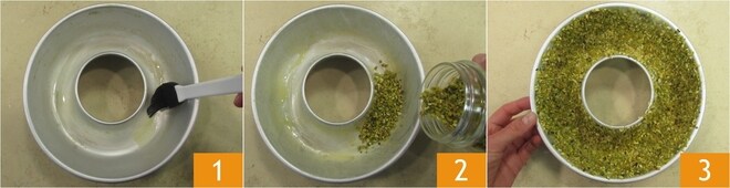 Para preparar o bolo de laranja, primeiro unte a forma de bolo 1 e polvilhe com a granola de pistache 2 para cobri-la completamente 3. Reserve e passe para a preparação da massa.