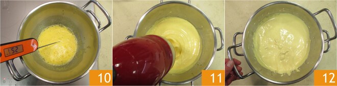 Uma vez atingida a temperatura certa 10, retire a tigela do banho-maria e bata com a batedeira elétrica 11 até obter uma consistência espumosa 12.