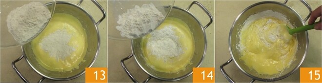 Nesse ponto, incorpore a farinha 13 e o amido de milho 14, misturando delicadamente com uma espátula 15.
