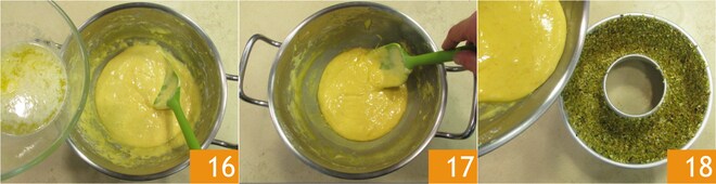 Por último, adicione a manteiga, que você derreteu previamente e deixou esfriar 16. Misture novamente para combinar 17, depois despeje a massa na forma e encha até três quartos 18.
