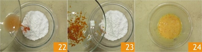 Enquanto isso, prepare a cobertura: em uma tigela pequena, despeje o açúcar de confeiteiro e o suco de laranja 22, depois adicione as raspas de laranja 23 e misture com um batedor até obter uma mistura fluida e homogênea 24.