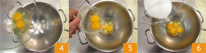 Em uma tigela em banho-maria, despeje os ovos inteiros 4, as gemas 5 e o açúcar 6.