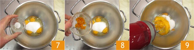 Adicione o sal 7 e as raspas de laranja 8. Misture com um batedor enquanto leva a mistura à temperatura de 45° 9.