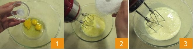 Para preparar o bolo de leite quente, quebre os ovos em uma tigela, adicione uma pitada de sal 1 e ligue a batedeira. Enquanto a batedeira está em funcionamento, adicione gradualmente o açúcar, assim você facilitará a absorção 2. Quando a mistura estiver clara e espumosa, cerca de 10 minutos depois, desligue as batedeiras elétricas 3.