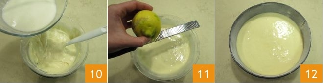 Agora despeje a pastella no recipiente maior com o restante da massa 10, misture delicadamente com uma espátula e, por fim, rale a casca de limão 11. Unte e enfarinhe uma forma de 20 cm de diâmetro e preencha com a massa obtida 12.