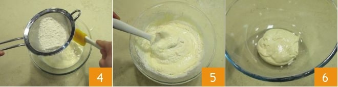 Coloque uma peneira sobre a tigela e peneire os pós, então a farinha e o fermento, adicionando-os gradualmente enquanto mexe com uma espátula de baixo para cima 4, de modo a incorporá-los sem desmontar a mistura 5. Neste ponto, retire algumas colheradas de massa e reserve em outro recipiente 6.