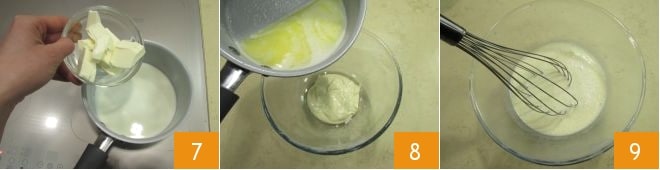 Em uma panela, aqueça o leite em fogo médio e depois adicione a manteiga 7: deixe derreter completamente e leve tudo a quase ferver. Assim que estiver na temperatura, desligue o fogo e despeje a mistura no recipiente com as colheradas de massa que você havia reservado anteriormente 8. Misture bem com um batedor para obter uma espécie de pastella 9.