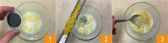 Para preparar o lemon poppy seed cake, primeiro derreta a manteiga em uma panela ou no micro-ondas, depois adicione as sementes de papoula 1 e as raspas dos limões 2. Misture e deixe o composto em infusão à temperatura ambiente por alguns minutos 3.