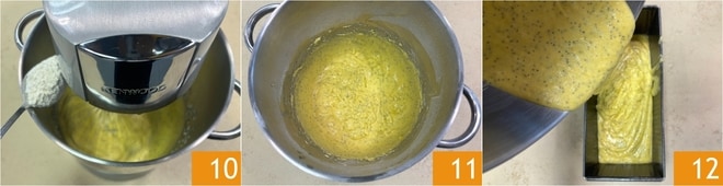 Incorpore os ingredientes secos aumentando novamente a velocidade 10 e continue a trabalhar a mistura até obter uma consistência bem montada 11. Unte uma forma de 26x9x7,5 cm e preencha com a massa 12. Asse em forno estático preaquecido a 170° por 55 minutos.