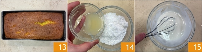 Verifique o cozimento com um palito e retire do forno, então deixe esfriar por cerca de vinte minutos 13. Enquanto isso, prepare a cobertura: coloque o açúcar de confeiteiro e o suco de limão em uma tigelinha 14 e misture até obter uma consistência densa e homogênea 15.