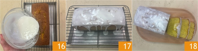 Vire o bolo sobre uma grade com uma bandeja por baixo, então despeje a cobertura sobre toda a superfície 16, deixando escorrer pelos lados 17. Deixe secar a cobertura à temperatura ambiente e sirva seu lemon poppy seed cake 18!