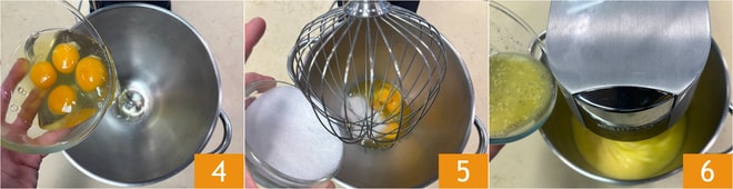 Coloque os ovos na tigela de uma batedeira com batedor 4, ligue-a em velocidade média-baixa e adicione o açúcar 5. Aumente a velocidade e misture por 2 minutos, então despeje a manteiga que você deixou em infusão 6.