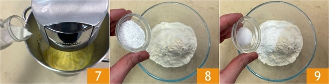 Neste ponto, abaixe ligeiramente a velocidade e adicione o creme de leite em fio 7. Em uma tigela à parte, misture a farinha com o fermento 8 e o sal 9.