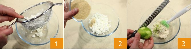 Para preparar o bolo de maçã bem fofinho, comece peneirando a ricota em temperatura ambiente em uma peneira colocada sobre um recipiente 1, depois junte o açúcar mascavo 2 e rale a casca do limão/lima 3, guardando-o pois depois você também vai usar o suco. Misture o composto e reserve.