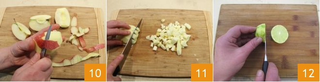Desligue as batedeiras e dedique-se às maçãs. Então descasque-as, elimine o miolo central 10 e por fim corte-as em pedacinhos de 1–2 centímetros 11 e coloque-os em uma tigela. Pegue o limão/lima que você tinha reservado, corte-o ao meio 12.