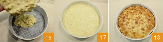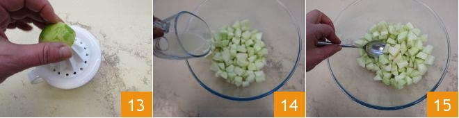 e esprema para obter o suco 13. Despeje-o imediatamente sobre as maçãs 14; assim as maçãs manterão a cor clara. Misture as maçãs e incorpore-as na massa 15.