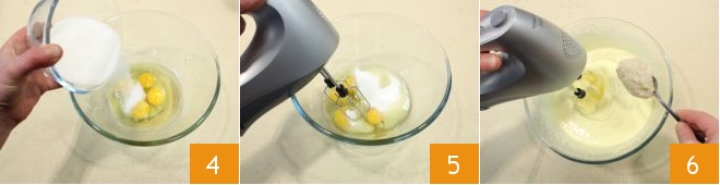 Em outra tigela coloque os ovos 4, junte uma pitada de sal e o açúcar refinado 5 e bata com batedeira elétrica por alguns minutos, até o composto ficar um pouco aerado. Em seguida adicione a mistura de açúcar e ricota uma colher de cada vez 6, para que os ingredientes se incorporem bem. Se a porção anterior ainda não tiver sido incorporada, espere antes de adicionar a próxima.