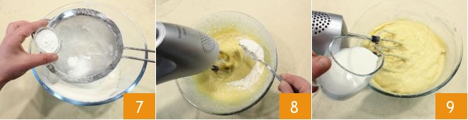Em uma tigela peneire a farinha com o fermento 7 e adicione também esta, uma colher de cada vez, enquanto a batedeira ainda estiver em funcionamento 8. O composto a esse ponto ficará bastante consistente, então suavize-o despejando o leite em fio, em temperatura ambiente 9.