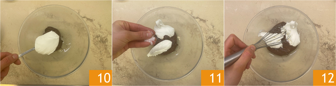 Enquanto isso, prepare o creme para o recheio: em uma tigela, misture a Nutella e o mascarpone 10, adicione uma pitada de sal 11 e misture com um batedor para combinar bem o composto 12. Transfira o creme obtido para um saco de confeitar com bico liso em formato de gota.