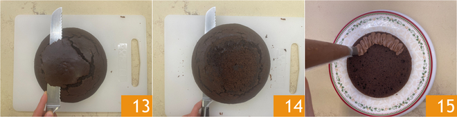 Depois de esfriar, corte a parte superior do bolo para nivelar a superfície 13 e divida-o ao meio horizontalmente 14. Recheie a primeira camada com o creme 15.