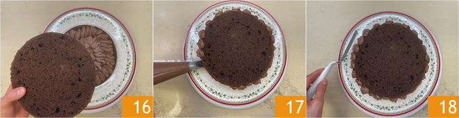 Cubra com a segunda camada 16, depois esprema um pouco de creme nas bordas 17 e nivele com uma espátula para distribuí-lo de maneira uniforme 18.