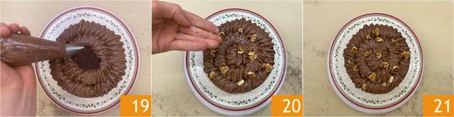 Com o creme restante, decore a superfície criando pequenas ondas com movimentos de cima para baixo 19. Por fim, decore com nozes e sal Maldon 20. Seu bolo de Nutella e mascarpone está pronto para ser saboreado 21!