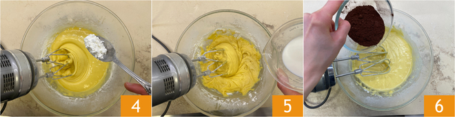 Adicione da mesma maneira também o amido de milho 5. Após incorporar os ingredientes secos, dilua com o leite 5 e por último adicione o cacau 6.