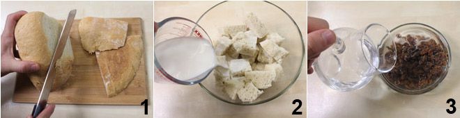 Para preparar o bolo de pão, retire a crosta do pão 1: você deverá obter 300 g de miolo de pão, que será cortado em pedaços e colocado em uma tigela para molhar com o leite por cerca de 10 minutos 2. Coloque a uva-passa para amolecer em água, por cinco minutos, para reavivar 3.