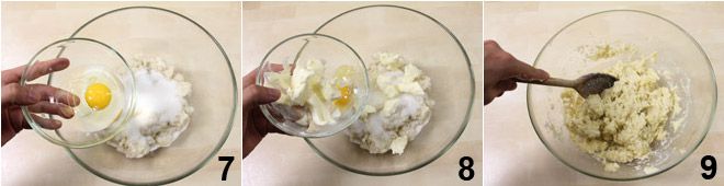 Passados os dez minutos, esprema bem o miolo e adicione o açúcar e o ovo 8, depois a manteiga amolecida cortada em pedaços 8. Misture bem com uma colher de pau para integrar todos os ingredientes 9.