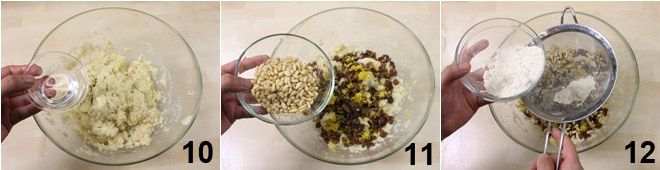 Adicione a grappa 10, depois a uva-passa escorrida, as raspas de limão, os pinhões 11 e por último a farinha peneirada 12.