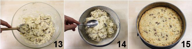 Misture muito bem os ingredientes até obter uma massa homogênea e compacta 13, que você transferirá para a forma untada 14. Com as costas de uma colher, espalhe uniformemente e alise a superfície 14, leve o bolo ao forno a 180°C por cerca de 60 minutos: a superfície deve ficar dourada 15. Retire do forno e deixe esfriar: seu bolo de pão está pronto!