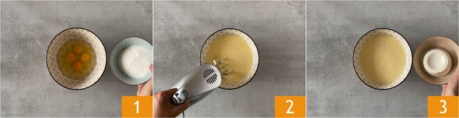 Para preparar o bolo de fôrma de ricota e peras, comece pelos ovos: bata-os com o açúcar 1 até obter uma mistura homogênea e espumosa 2. Adicione a ricota 3.