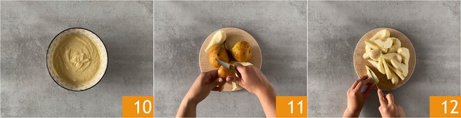 Você deve obter uma massa densa e encorpada 10. Descasque as peras 11, depois corte-as em fatias 12.