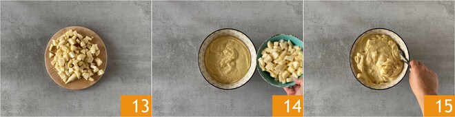 Corte em cubinhos 13. Adicione as peras à massa e misture com uma espátula 14 15.