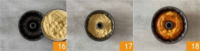 Despeje a massa em uma fôrma de bolo untada e enfarinhada 16 17. Asse em forno estático preaquecido a 180°C por 45 minutos, fazendo o teste do palito para verificar o cozimento. Retire do forno 18, deixe amornar, depois desenforme e deixe esfriar completamente antes de polvilhar a gosto com açúcar de confeiteiro!